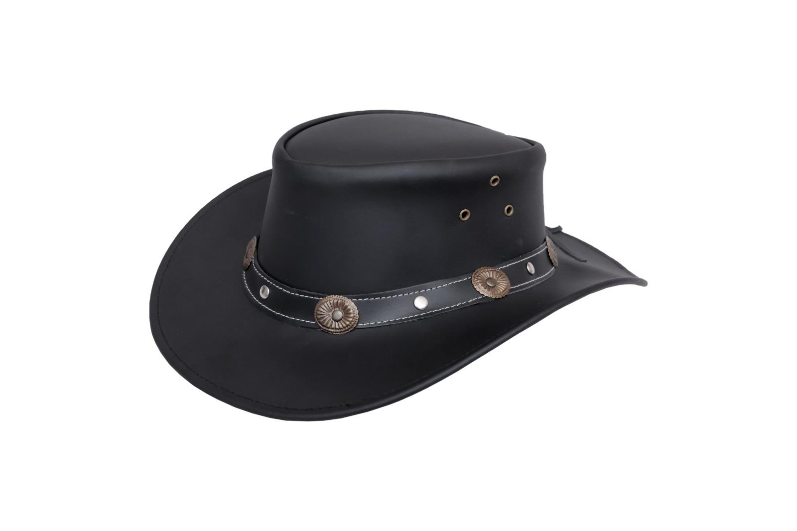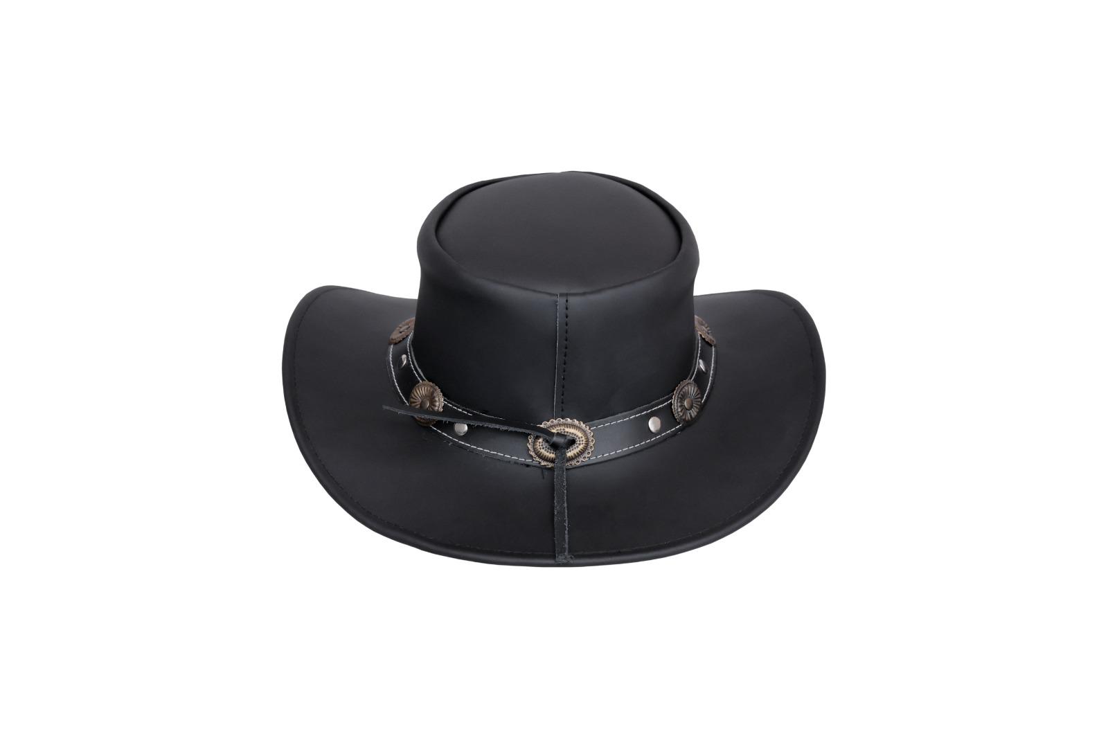 Decorative black leather hatband with antique silver conchos